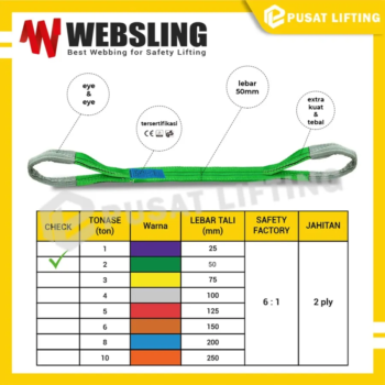 Keamanan Terjamin: Webbing Sling 2 Ton WEBSLING dilengkapi dengan sistem penguncian yang kuat, memastikan keamanan dan kestabilan beban selama proses pengangkutan. Ini memberikan ketenangan pikiran selama bekerja.