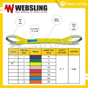 Penting untuk selalu mematuhi panduan penggunaan yang disediakan oleh produsen dan menjalani pemeriksaan rutin untuk memastikan bahwa webbing sling tetap dalam kondisi optimal. Dengan fitur-fitur tersebut, Webbing Sling 3 Ton WEBSLING menjadi pilihan yang baik untuk tugas pengangkutan beban berat.