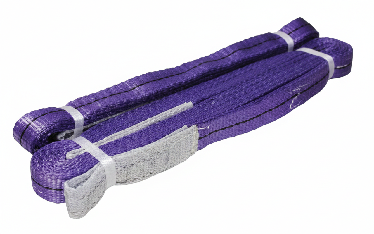 Dibuat dari material polyester pilihan, webbing sling ini memiliki kode warna ungu (Violet) sesuai standar internasional untuk kapasitas 1 Ton. Keunggulan utama material ini adalah sifatnya yang lembut sehingga tidak merusak permukaan benda yang diangkat (seperti mesin atau komponen halus), namun tetap memiliki Safety Factor tinggi. Desain lubang kait (eye) dijahit dengan pola penguatan khusus guna mencegah robekan saat menerima beban puncak.